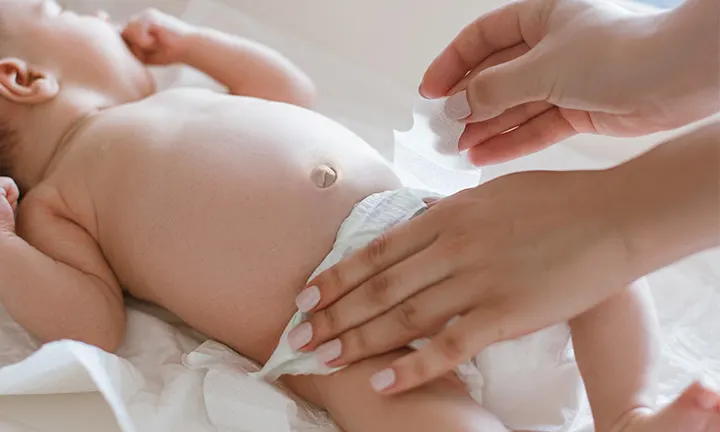 2. Reinige sanft den Windelbereich deines Babys mit Feuchttüchern oder einem feuchten Tuch.