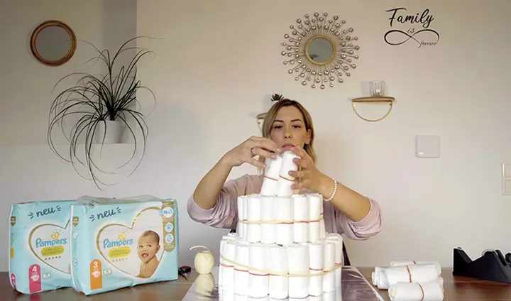 Babyparty: Deine Windeltorte eignet sich auch als perfektes Dekorationselement für eine Babyparty.